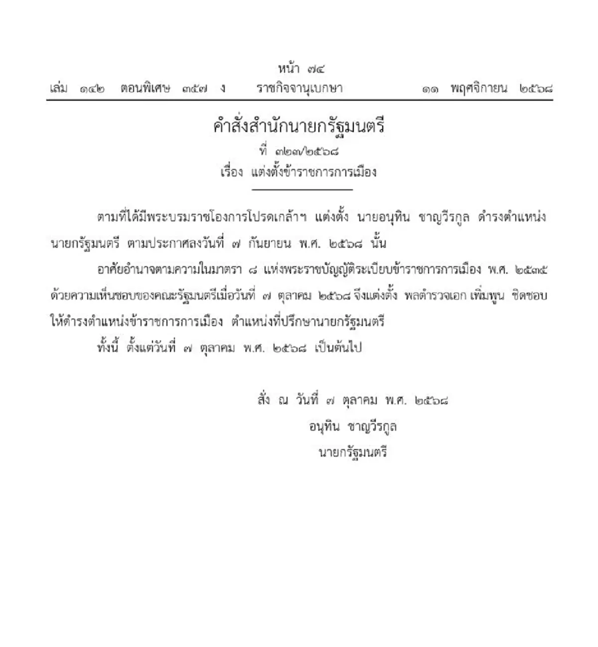 ราชกิจจานุเบกษาเผยแพร่คำสั่งสำนักนายกรัฐมนตรี ที่ 323/2568 เรื่องแต่งตั้งข้าราชการการเมือง โดยมีคำสั่งแต่งตั้ง พลตำรวจเอก เพิ่มพูน ชิดชอบ ให้ดำรงตำแหน่งที่ปรึกษานายกรัฐมนตรี มีผลตั้งแต่วันที่ 7 ตุลาคม 2568 เป็นต้นไป ลงนามโดย นายอนุทิน ชาญวีรกูล นายกรัฐมนตรี